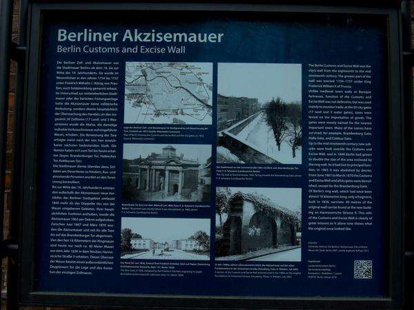 Zschocke ist stolz auf die Infotafel, deren Text er selbst verfasst hat. Zehn Jahre Amtsgänge hatte er hinter sich, als die Tafel im Februar 2018 aufgestellt wurde. Drei Funktionen, erzählt er, erfüllte die Mauer bis zum Beginn der Abrissarbeiten im Jahr 1863 – weil sie in der explosiv wachsenden Metropole ihren Zweck verloren hatte: nach innen als Schutzwall gegen Deserteure (zumindest bis zur Einführung der allgemeinen Wehrpflicht in Preußen 1814), als Einnahmequelle sowie zur Einreisekontrolle.
