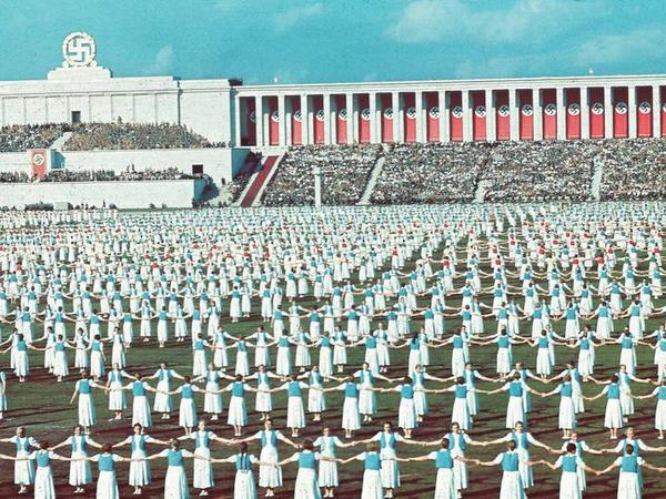 Folgerichtig ist die Ausstellung, die das ganze, stützenlose erste Obergeschoss des Museums füllt, ringsum an den Wänden mit großformatigen Abzügen von Farbfotografien – noch etwas, worauf das Regime stolz war – dekoriert, die den Nürnberger Reichsparteitag ebenso zeigen wie ein „Weihnachtsessen“ für Uniformträger im Münchner Bürgerbräukeller.