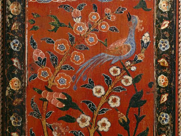 Sie scheinen sich aus der Täfelung des Aleppo-Zimmers befreit zu haben, sitzen in kleinen Gruppen beieinander, an der Ecke, an der Stufe, auf einem kleinen Podest – insgesamt 27 kleine bunte Vögel aus fragilem Glas. Das Aleppo-Zimmer ist eines der bedeutendsten Objekte im Museum für Islamische Kunst Berlin im Pergamonmuseum. Friedrich Sarre, der Gründer des Museums, hatte die rotgrundige und üppig bemalte Vertäfelung aus dem 17. Jahrhundert in Aleppo bei der Renovierung des Hauses Bayt Wakil für das Museum gekauft.