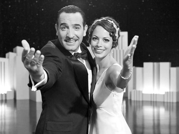Dujardin ist der Stummfilmstar George Valentin – in einem (Fast-)Stummfilm, in Schwarzweiß, mit englischen Zwischentiteln. Der Film beginnt 1927 in Hollywood, die Stummfilmära geht ihrem abrupten Ende entgegen, mitsamt den Karrieren ihrer Stars. Der unaufhaltsame Abstieg von George Valentin wird nur durch eine hübsche Autogrammjägerin aufgehalten, die ihm einst am roten Teppich einen Kuss auf die Wange drückte: Peppy Miller (Bérénice Bejo), Fan, Statistin, Klein-, Neben-, Hauptdarstellerin, Tonfilmstar. Und, ja, es ist Liebe.