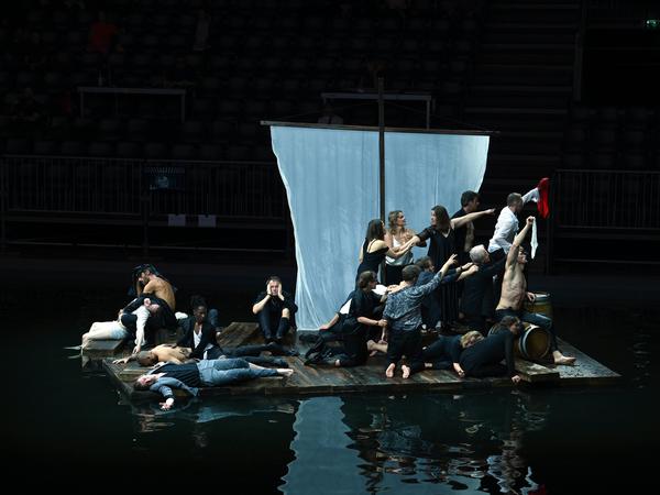 Mit dem szenisch aufbereiteten Oratorium „Das Floß der Medusa“ von Hans Werner Henze hat sich die Komische Oper Berlin eine glanzvolle erste Premiere dieser Spielzeit verschafft – die erste auch nach dem Auszug aus ihrem Domizil in der Behrensstraße. Sinnigerweise zeigt sie, dass Heimatlosigkeit eine Chance sein kann, ein Ausnahmezustand auch ungeahnte Kräfte freisetzt. Denn ein solches Spektakel auf der Riesenbühne, das jede Menge technisches Equipment verlangt, mit gewaltigem Chor- und Orchesterapparat hätte man im Stammhaus vermutlich gar nicht stemmen können.