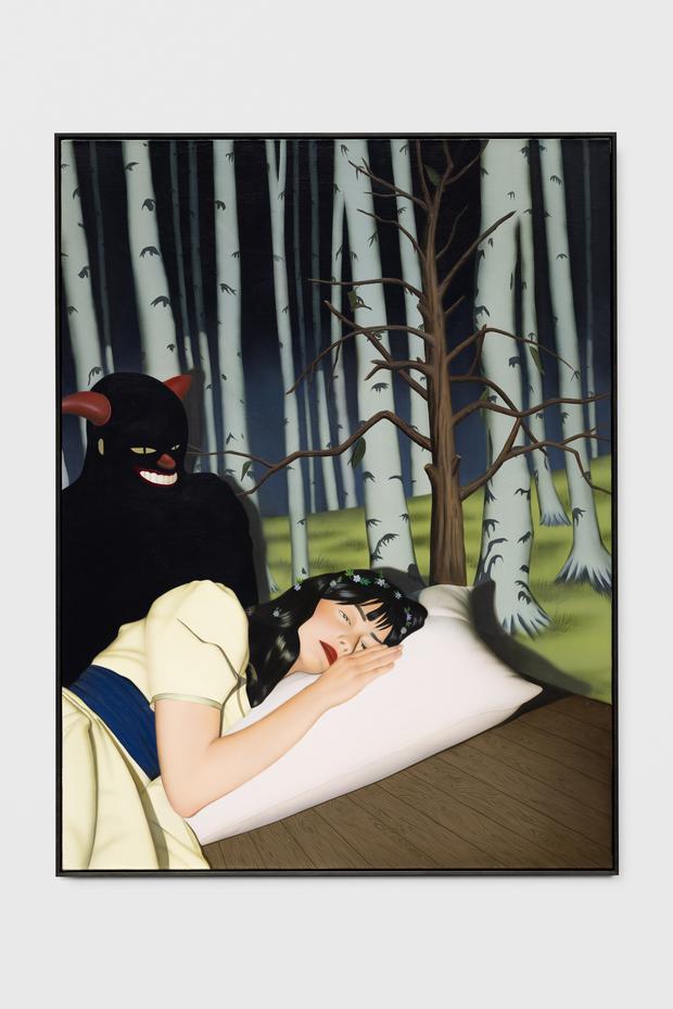 Der Schattenwurf lässt den Bildhintergrund (mutmaßlich ein Museumskabinett) zur Fototapete verflachen. Ähnlich die Raumkonzeption in Sun Yitians Großformat „Romantic Room“, von dem der Ausstellungstitel stammt und in dem eine Schneewittchenfigur vor einer tapetenhaften Birkenwaldkulisse schlummert. Betrachtet wird die porzellanhäutige Schöne von einer düsteren Teufelsfigur.