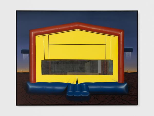 Die hyperrealistische Darstellungsweise betont die Verletzlichkeit der Strukturen, deren Wölbungen, Falten und Glanzpunkte die Malerin souverän betont. Das gelb-blau-rote, durchaus an Mondrians Abstraktionen erinnernde Großformat „Shelter VII“ zeigt eine Hüpfburg auf rissig-ausgetrocknetem Boden, während das silbergraue Aufblas-Zelt „Shelter VI“ auf einer mondbeschienenen Graslandschaft aufgeschlagen ist.