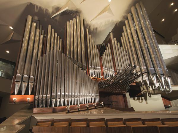 In der Philharmonie bildet das Orchester den Mittelpunkt, und zwar wortwörtlich: Das Publikum umringt die Musikerinnen und Musiker von allen Seiten. Die Orgel hoch oben über dem Block E auf der rechten Saal-Seite fällt da kaum auf. Aber sie ist ein beachtliches Instrument, mit 6500 Pfeifen die zweitgrößte in Berlin.