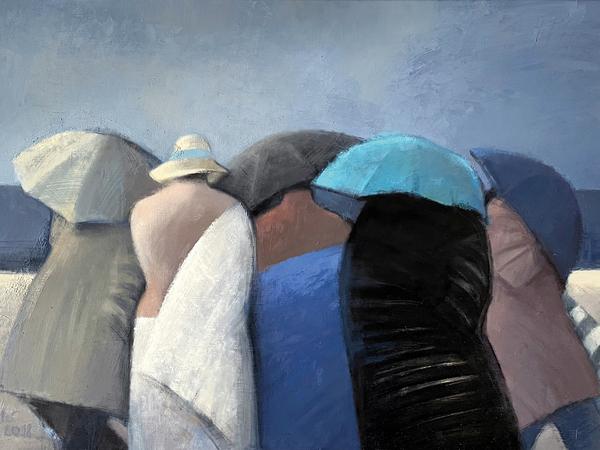 Sie drängen sich dicht aneinander, die farbigen Regenschirme sind aufgespannt. Als müsse sich das Quintett auf dem Bild von Barbara Müller-Kageler gemeinsam gegen den Sturm und heftigen Regen behaupten. Doch man sieht keine aufgewühlte See: Das Meer, der Strand und ein blauer Horizont liegen als stille Waagerechte vor den Figuren, die mit dem Rücken zum Betrachter stehen. Ein eigenartiger Kontrast tut sich zwischen Schutzsuchenden und der freundlichen Gleichgültigkeit der Landschaft auf, beides wirkt wie eingefroren.
