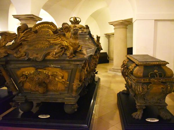 Will man die kunsthistorische Entwicklung von 500 Jahren Sepulkralkultur an der Hohenzollerngruft ablesen, muss man auch zukünftig die nicht mehr mit Gebeinen belegten Prunksärge oben in der Predigtkirche besuchen gehen, die links und rechts in den Nischen stehen. Den des Großen Kurfürsten und seiner Gattin und vor allem Andreas Schlüters’ hochbarocke Sarkophage von König Friedrich I. in Preußen und Königin Sophie Charlotte, deren Name von einem knöchernen Sensenmann am Fuß des Sarges in das Buch des Todes geschrieben wird. Es sind dekorative Schlachtschiffe aus vergoldetem Blei und Zinn, die der Unausweichlichkeit des Todes mit dem Prunk irdischer Bildhauerkunst trotzen.