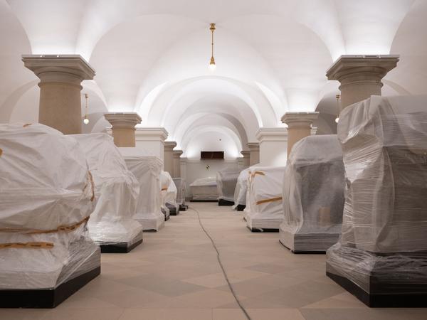 Das ist seit 1999, als die Gruft in ihrer jetzigen Form eröffnet wurde, allerdings Geschichte. Nirgends in Berlin ist es so aufgeräumt, freundlich und hell wie in der Hohenzollerngruft. Der Gruselfaktor: Null. Zumindest wenn, wie jetzt, die Beleuchtung auf 100 Prozent hochgefahren ist, zur Eröffnung wird sie dann gedimmt. Was ans Herz geht, selbst nun, wo sie noch zu kleinen weißen Papierpaketen verschnürt sind, ist die Menge der Kindersärge. In der neuen chronologischen Anordnung der Gruft, die zukünftig auch Familiengruppen sichtbar macht, stehen die verstorbenen Kinder bei den Eltern. Ihre Sarkophage sprechen davon, dass die hohe Kindersterblichkeit früherer Jahrhunderte auch den privilegierten Adel nicht verschonte.
