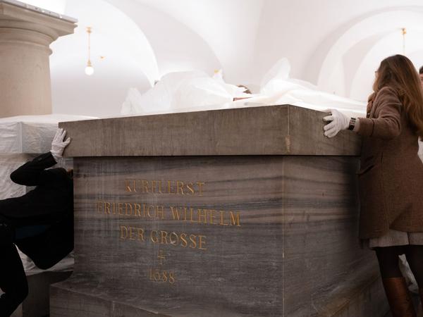 Ein Schnitt mit dem Messer durch die Klebefolie und die knisternden Papierlagen heben sich. Darunter wird ein sachlicher Koloss aus grauem Marmor sichtbar, den vorne die schlichte goldene Inschrift „Kurfürst Friedrich Wilhelm, der Große“ samt dem Sterbejahr ziert. Restaurator Thomas Lucker, Dombaumeisterin Sonja Tubbesing, Dompredigerin Christiane Münker und Birgit Walter, die die zukünftige Ausstellung der Hohenzollerngruft kuratiert, wachen bei dem Besichtigungstermin darüber, dass die Pressevertreter keinen Unsinn machen.