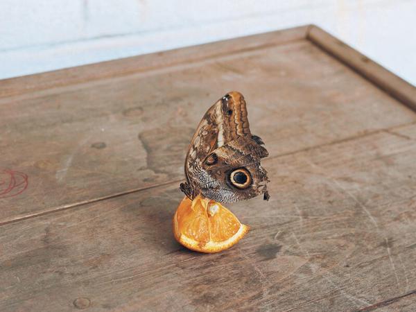 Manche der zwischen 2018 und 2021 entstandenen Fotografien muten fast wie Schnappschüsse an: Da strecken sich sommerliche Ranken in die zarten Wolken über „Fort Worth, Texas“, und ein braun-weißer Schmetterling verharrt in „Philadelphia, Pennsylvania“ auf einem Stück Orange. Doch Soth fotografiert mit Großformatkamera – einem jener stativgestützten Ungetüme, die man aus alten Filmen kennt. Da braucht jede Aufnahme Zeit und Ruhe, sowohl zum Aufbauen als auch zum Belichten. Das Ergebnis ist technisch unmittelbar beeindruckend. Man kann an diesen Schmetterling aus Philadelphia so nah herangehen, wie man will: Das Bild bleibt bis ins kleinste Detail gestochen scharf. Vom leicht zerrupften Flügel bis zur Maserung des Holzes dahinter.