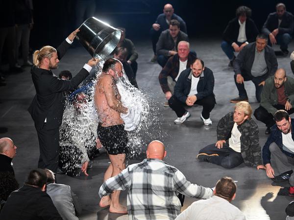 Die Neueinstudierung in der Jahrhunderthalle ist also immersives Theater, bei dem die Trennung von Zuschauerraum und Bühne aufgehoben ist - doch im Gegensatz zu immersiven theatralischen Aktionen wie etwa der Gruppe Signa wird man weder durch Einlass-Rituale, Kostüme oder durch die Erkundung theaterferner Orte in das Geschehen eingebunden. Konsequent wird auch literarische Vorlage Fjodor Dostojewskis „Aufzeichnungen aus einem Totenhaus“ (1861) nicht zitiert.
