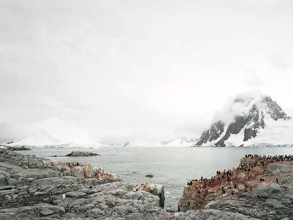Hans-Christian Schink hat ein großes, halb verwestes Tiergerippe im Foto festgehalten. War das einmal ein Walfisch? Oder vielleicht ein Mammut? Gab es überhaupt Mammuts in der Antarktis? Ein anderes Foto zeigt eine Pinguinkolonie auf einem grauen Felsen, der dort, wo sich die Tiere bewegen, rötlich schimmert. Es war ihr Kot, der den Stein verfärbt hat. Die Pinguine stehen dicht beieinander, sie haben ihre Schnäbel einander zugewandt, als würden sie reden, und so, wie sie die Schnäbel nach oben, unten, links oder rechts recken, scheint es eine sehr lebhafte Diskussion zu sein.