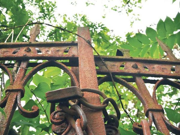 Die gemauerten Pfeiler des Zauns sind mit Graffiti übersäht, nur noch der Rost scheint das prächtige Gitter zusammenzuhalten, ein typisches Jahrhundertwende-Modell mit metallenen Schnörkeln, gekrönt von stilisierten Pfeilspitzen. Wo einst die Klingel war, gähnt ein Loch, laienhaft ist die ehemalige Eingangspforte oben mit Stacheldraht umwickelt.
