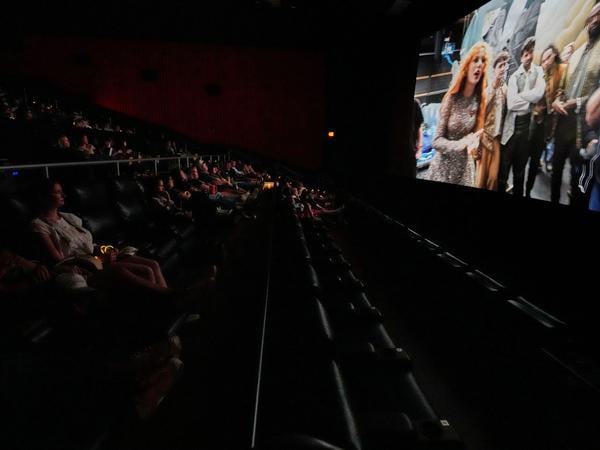 Der Kinosaal ist voll, hauptsächlich mit Frauen und Mädchen, die zur ersten Nacht des internationalen Taylor-Swift-Kinoevents erschienen sind. Viele tragen „Eras“-Tour-Merch, einige die mit Sternen bestickten Cardigans, die Swift verkauft, manche haben sich auch verkleidet, wie damals bei der Tour, in Glitzer-Minis und Cowboy-Boots.