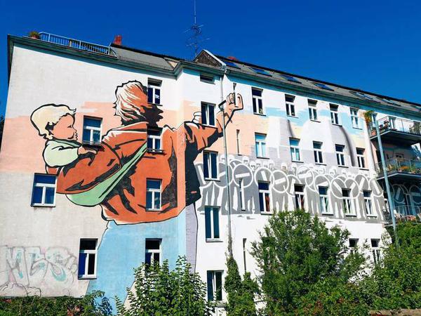 Harald Juch ist heute 69. Er trägt immer noch Jeans und die Haare vergleichsweise lang, selbst wenn sie weiß und schütter geworden sind. Es braucht nicht viel Fantasie, sich vorzustellen, dass der Mann auf der Mauer, würde er sich umdrehen, Juch ziemlich ähnlich sähe. Er selbst bestreitet das, sagt, es müsse nicht einmal ein Mann, könne auch eine Frau sein. Das Kind auf dem Arm freilich, zu dem hat ihn sein Sohn Ulf inspiriert, der damals ein Jahr alt war. Denn Juch ist – nein, nicht der Maler dieses Bildes, dazu ist es zu groß, dazu bedarf es vieler Hände mehr. Aber er hat es 1986 entworfen und wie ein Dirigent die Ausführung gelenkt.