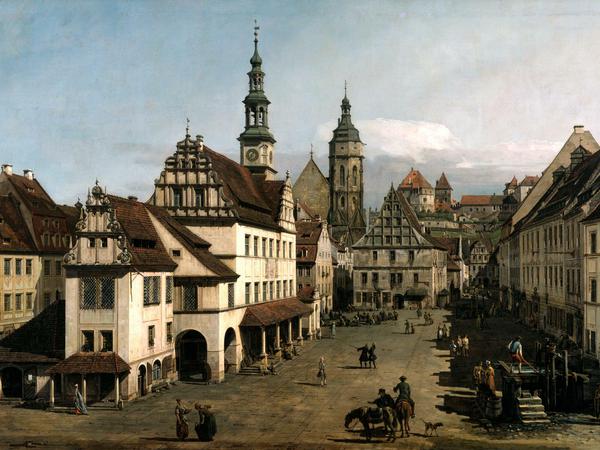 Es sind solche nur Zentimeter großen Details, die die Gemälde Bernardo Bellottos lebendig machen. Mehr noch, die beiden Musikergruppen verknüpfen die wohl als Pendants gedachten, formatgleichen Ansichten der Kreuzkirche und der Frauenkirche, zwei der herausragenden Kirchenbauten Dresdens. Dorthin ging der aus Venedig stammende Maler 1747 im Alter von 25 Jahren, um mit der beim Onkel Antonio Canal genannt Canaletto erlernten Vedutenmalerei seinen Lebensunterhalt zu verdienen.