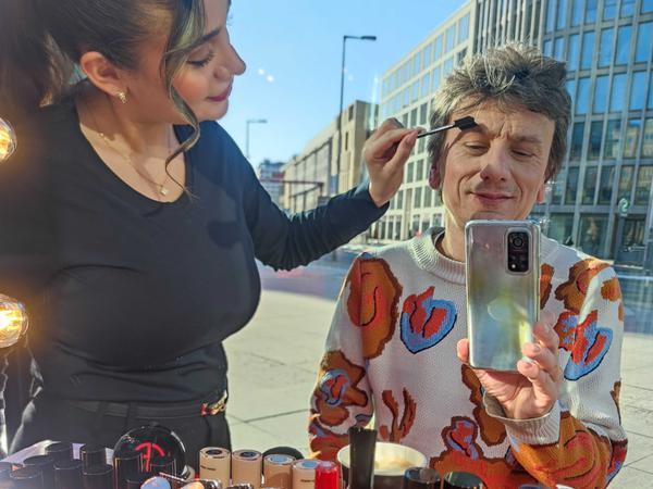 „Können Sie was machen, damit ich nicht so müde aussehe?“, frage ich die Frau in der Schminkbox, die sie auf den Potsdamer Platz gestellt haben, damit der nicht so leer in Berlins Mitte rumsteht. Die Frau mit knallig roten Lippen trägt mit einem Pinsel Farbe unter meinen Augen auf und sagt dabei: „Deine Haut hat einen blassen Olivton.“ Danach Concealer, etwas zum Abdecken, ein bisschen Glitzer, eine glänzende Creme für die Lippen, ein Hauch Schwarz für die Augenbrauen. Schon kann ich wieder weitermachen bis zum Morgengrauen.