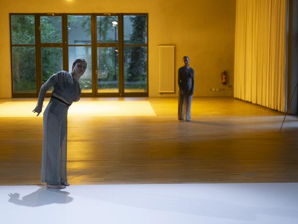 Die Zuschauer sitzen auf dem Boden und umringen die beiden Spielflächen. Das Sounddesign von Sam Auinger hat das Publikum schon eingestimmt auf diesen Abend, an dem es um eine erweiterte Wahrnehmung gehen soll. Die Geräusche aus der Umgebung werden fein gefiltert, sodass ein Raumklang entsteht, der sich mal auszudehnen scheint, mal als leises Dröhnen wahrgenommen wird.