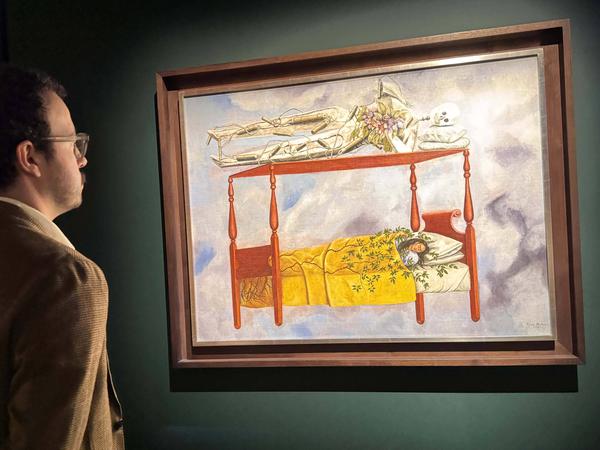 „El sueño (La cama)“ war 1980 zuletzt versteigert worden – für 51.000 Dollar, also zu einem Bruchteil des jetzigen Preises. Das Werk zeigt Kahlo schlafend in einem Bett liegend, das am Himmel zu schweben scheint. Das Bett wird überlagert von einem riesigen Skelett, dessen Beine mit Dynamit umwickelt sind.