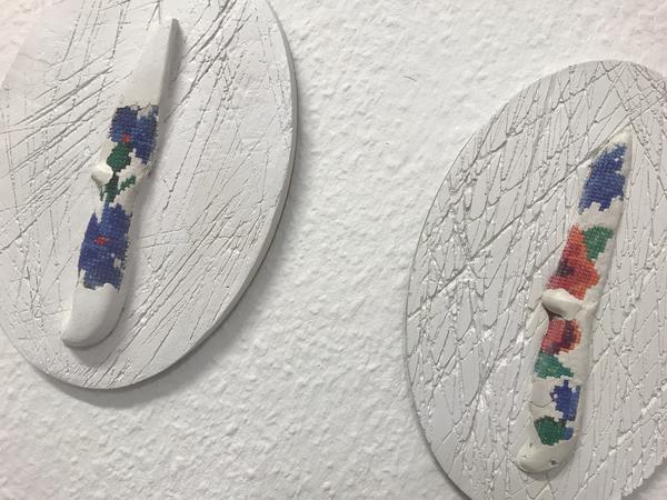 Die Künstlerin Alena Shybunova verleiht ihren inneren Gedanken mit alten Stickereien und Gips auf Hartfaserplatten Ausdruck. „In der ersten Zeit des Krieges zog ich vorübergehend von Kiew nach Lemberg, an einen sichereren Ort. Auf dem örtlichen Flohmarkt kaufte ich einen Kissenbezug mit traditioneller ukrainischer Stickerei. Ich schnitt ihn zu, verputzte ihn mit Gips und verwandelte ihn in eine Waffe. Das ist meine eigene Geste des Widerstands“, so die Künstlerin.