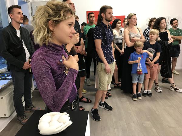 Mit einem großartigen Gemeinschaftsabend mit Diskussionen, Getränken, Live-Musik und gemalten Umarmungen hat in der Friedrichshainer Green Hill Gallery eine Ausstellung begonnen, die Kunst von sechs ukrainischen Künstlerinnen vorstellt. Zu sehen gibt es den ganzen Sommer über (bis 26. August) weiße „Pysanky“, eine abgewandelte Form der berühmten, eigentlich farbigen ukrainischen Ostereier, traditionelle Stickereien auf Messern, Bilder zur Frauenbewegung und andere Erfahrungen von ukrainischen Künstlerinnen aus Kiew, Charkiw, Lubny und anderen Städten.