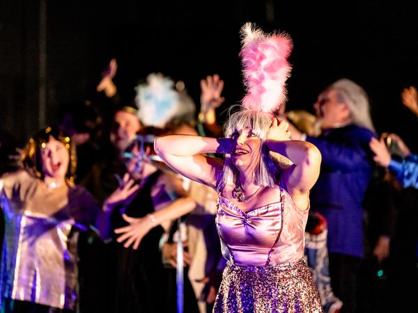 Es beginnt mit einer wüsten Choreografie auf nahezu leerer Bühne, so hysterisch wie Verdis Musik. Eine Mischung aus Kindergeburtstag, Karneval und Saturnalien, mit Chorist:innen in den schrägsten Verkleidungen (Kostüme: Jochen Hochfeld), die den Mangel eines gebauten Bühnenbildes verschmerzen lassen. Die Anführerin der Feierhorde ist Violetta, im Singen und Tanzen wechselt die Partykönigin ständig Perücken und Kleider.