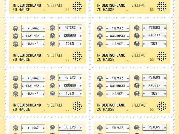 Sie wird durch die unterschiedlichen Familiennamen am Klingelbrett symbolisiert – gerade so, als sei die Herausforderung bereits gemeistert. Insofern die Ausgabe von Briefmarken in staatlicher Verantwortung liegt, sind diese ein Medium der politischen Ikonographie.