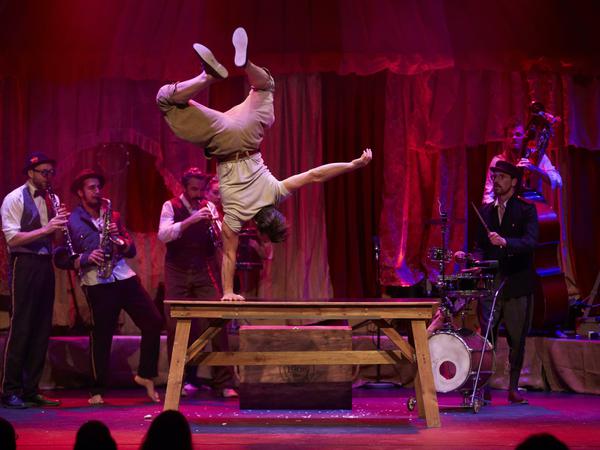 Den fünf, manchmal gar sechs Musikern der Uncanny Carnival Band stehen auf der Bühne in den Hackeschen Höfen gerade mal vier Akrobatinnen und Akrobaten gegenüber. Angesichts der fulminant aufspielenden Jazzband haben sie ihre liebe Not, die Aufmerksamkeit auf sich zu ziehen. Mit dem im Varieté alter Schule vorherrschenden Prinzip, Instrumentalmusik als Klangteppich einzusetzen, der nur durch die Trommelwirbel zur Trapeznummer akzentuiert wird, hat das nichts mehr zu tun. Das Konzept des musikalischen Leiters Lucian McGuinness funktioniert. Seine mal einen New- Orleans-Band-March, mal ein melancholisches Bassklarinettensolo zelebrierende Truppe ist tatsächlich der Grund dafür, dass die Ensembleshow wie aus einem Guss gefügt scheint.