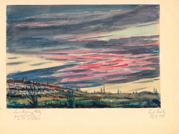Säuberlich notierte Gurk mit Bleistift am Rand die Uhrzeit und Wetterlage. „3 Grad, sehr windig, später Graupel“: Das war am 2. Januar 1938. Ein doppelt roter Streifen zwischen den Wolkenbändern glimmt. Auch wenn immer wieder die Sonne aufgeht in Gurks Bildern: Sie bleiben düster, die Himmel über Berlin.