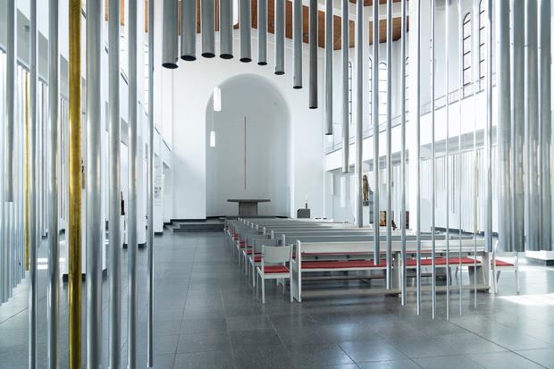 Zurück, wendeltreppab, in den Kirchenraum. Hier ist die Kunst stets kostenlos zugänglich. Tägliche Mittagsandachten ziehen Stammgäste oder Zufallsbekanntschaften an, manchmal nur eine Handvoll. Derzeit hat sich der Innenraum zum Jubiläum in ein Musikinstrument verwandelt. Rundum wie ein Vorhang hängen 366 riesige Metallröhren, orgelgleich, aber frei schwingend. Jede verkörpert einen Tag des Jahres. Die Sonntage schimmern messinggolden, Kirchenfeste kupferrot.
