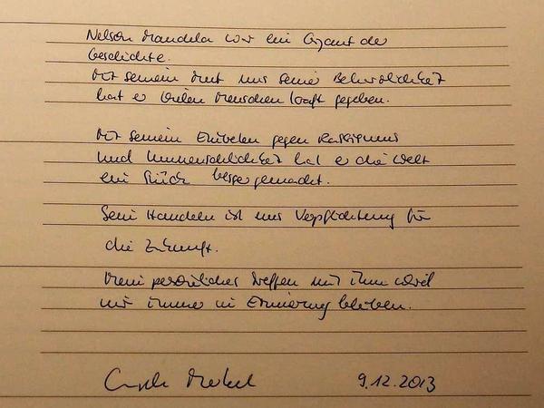 Der Kanzlerin war es genug, am Montagnachmittag in der südafrikanischen Botschaft in Berlin einen Eintrag im Kondolenzbuch zu hinterlassen. Aus Regierungskreisen heißt es, Kanzlerin Angela Merkel sei nicht zu den Trauerfeiern nach Südafrika gereist, weil Bundespräsident Joachim Gauck daran teilnehme. Allerdings gibt es nach Kenntnis des Bundespräsidialamtes keine verfassungsrechtlichen Gründe, die verhindern würden, "dass zwei Verfassungsorgane an den Trauerfeiern für Nelson Mandela teilnehmen". Es gibt vielleicht auch während Angela Merkels dritter Kanzlerschaft keinen weiteren Anlass, bei dem gleich "zwei Verfassungsorgane" auf einmal eine angemessene Aussage wären.