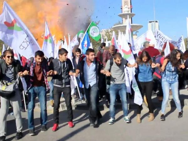 Die Stimmung vor dem Bahnhof von Ankara ist heiter, manche Demonstranten haben ihre Kinder mitgebracht. Doch plötzlich schießt ein paar Meter hinter den tanzenden Menschen eine Feuersäule in die Luft, dem gewaltigen Knall der Explosion folgt nach wenigen Sekunden ein zweiter.