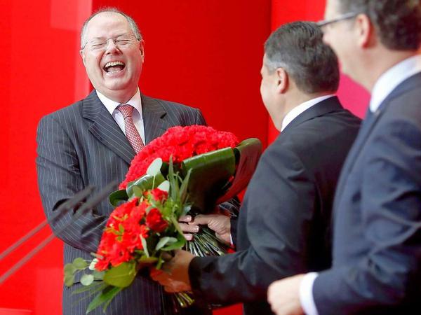 9:20 Uhr: Man muss bei Sigmar Gabriel genau hinhören. Er bedankt sich bei Peer Steinbrück und sagt: "Die SPD hat einen fulminanten Wahlkampf geführt und jedem ist klar geworden, das ist deine Partei und du bist unser Kandidat. Danke, dass du an Bord bleibst und die SPD mit stärkst und führst." Führen, das lässt aufhorchen. Kabinettsmitglied in einer großen Koalition will er ja nicht werden, aber es gibt andere Führungspositionen: Parteivize vielleicht oder sogar Fraktionschef? Spekulation.