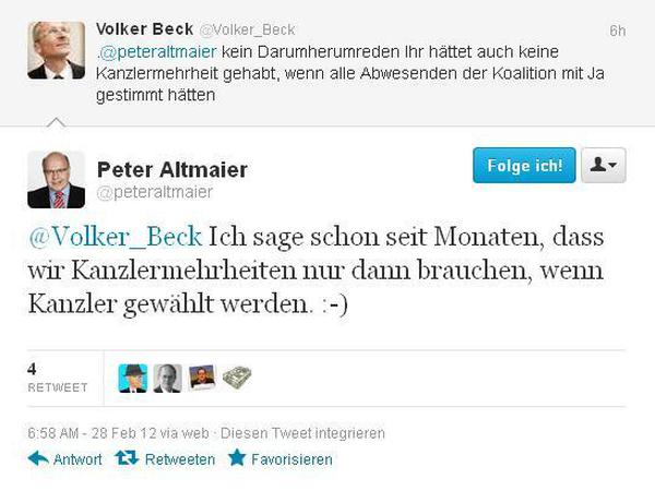Koalitionspolitiker versuchen unterdessen das Verfehlen der Kanzlermehrheit bei der Abstimmung zum zweiten Hilfspaket für Griechenland zu relativieren. „Wir haben eine stabile Koalition, die bis 2013 gemeinsam Politik machen wird“, sagte Unions-Parlamentsgeschäftsführer Peter Altmaier (CDU) am Dienstag vor Journalisten in Berlin. Die Koalition stehe zusammen und sei entschlossen, zusammen zu bleiben. Auf Twitter wehrte sich Altmaier gegen den Vorwurf des Grünen Volker Beck, dass die Kanzlermehrheit auch verfehlt worden wäre, wenn die abwesenden Abgeordneten der Koalition mit Ja gestimmt hätten. Altmaier antwortete: "Ich sage schon seit Monaten, dass wir Kanzlermehrheiten nur dann brauchen, wenn Kanzler gewählt werden."