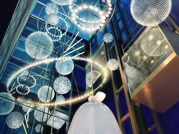 Wer durch die Tür des ehemaligen Bibliotheksbaus schreitet, der heute das Boutiquehotel „Andaz Amsterdam“ beherbergt, hält den unwillkürlich den Atem an: Man steht in einem perspektivisch verkürzten Durchgang und gelangt in ein Foyer, das sprachlos macht. Riesige Lampen in Glockenform – im Innern vergoldet und mit Kronleuchtern „gefüllt“ – hängen von einer unsichtbaren Decke, irgendwo hoch oben. Im Lichtschacht schweben weitere glitzernde Lampen und leuchtende Ringe; Assoziationen an einen Sternenhimmel enstehen. Zwei weiße runde Tische vor einem dunklen Holzregal bilden die Rezeption, ein Teppich mit den drei Andreaskreuzen aus dem Amsterdamer Wappen und Motiven des klassischen Delfter Blau zeigt an, in welchem Land man sich befindet. Hochlehnige rote Sessel erwecken nicht gerade den Eindruck einer Hotellobby. Vielmehr hat man das Gefühl, in einer Theater-Inszenierung zu stehen.