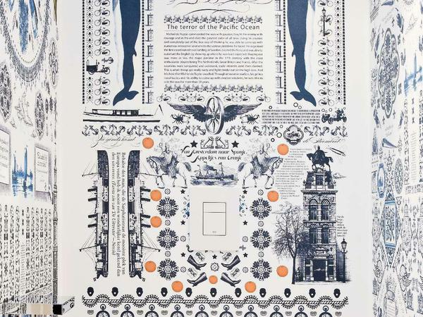 Die finden sich natürlich auch wieder im Hotel „Andaz“. Das Delfter Blau ist hier sozusagen das Leitmotiv. Auf den Zimmern stehen die „One-Minute-Delft-Blue“-Waschschüsseln, aber auch die Tapete auf den Toiletten hat den Bezug zur niederländischen Tradition: Briefmarken, alte Stiche, Literaturzitate – es findet sich alles auf dieser Wanders-Tapete in Weiß und Blau; dadurch wirkt sie so unverwechselbar niederländisch. Doch Wanders collagierte nicht nur altbekannte Motive, er schuf auch neue im historisierenden Look, wie etwa die Hand, die eine Karte hält, auf der steht: „Jeder Nachteil hat seinen Vorteil“ (Johan Cruyff).