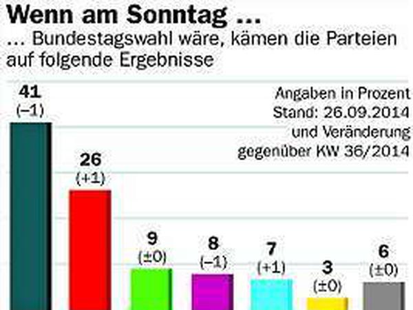 Politisch gesehen haben sich die Gewichte in der großen Koalition leicht zugunsten der SPD verschoben. Die Sozialdemokraten legten in der am Freitag veröffentlichen Umfrage der Forschungsgruppe Wahlen um einen Punkt zu auf 26 Prozent. Die CDU/CSU verlor einen Punkt und erreichte 41 Prozent. Zugewinne verbuchte auch die AfD, für die sich in der sogenannten Sonntagsfrage sieben Prozent der Befragten aussprachen. Die Grünen blieben unverändert bei neun Prozent, die Linke verlor einen Punkt auf acht Prozent.