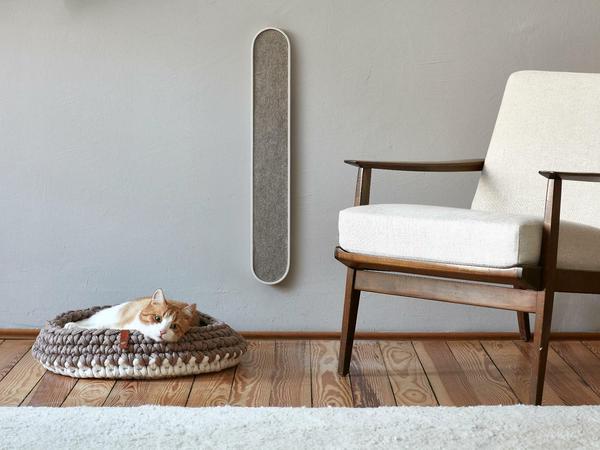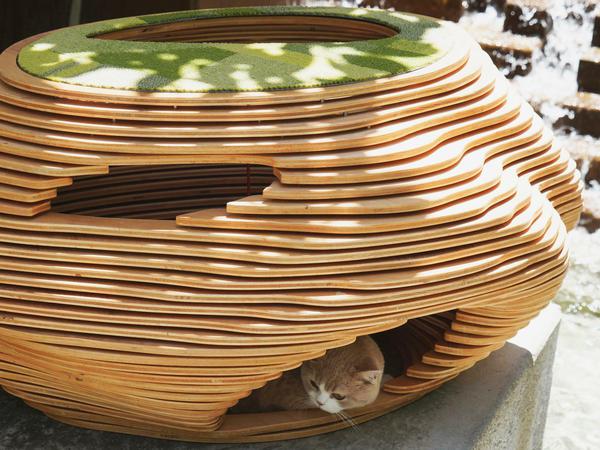 Fast architektonisch mutet die „Cat Bowl“ von Xiaofeng Mei an. Der aus einer chinesischen Architekten-Familie stammende Designer lebt in Los Angeles. „Meine Jugend habe ich damit verbracht, mit meinem Vater und Großvater Architekturmodelle zu bauen“, erinnert er sich. Zu dem kreativen Katzenkorb ließ er sich von dem konträren Verhalten der Tiere inspirieren, ihrem Wunsch nach Rückzug einerseits und ihrer schnellen Reaktion auf sich bewegende Geschöpfe wie Mäuse oder Goldfische in einem Glas. Einem solchen Goldfischglas ist der Katzenkorb nachempfunden. Zugleich erinnert er an das Yin- und Yangzeichen, das die Dichotomie zwischen Gegensätzen symbolisiert und durch die fließenden Bewegungen in der chinesischen Kalligraphie beeinflusst ist.