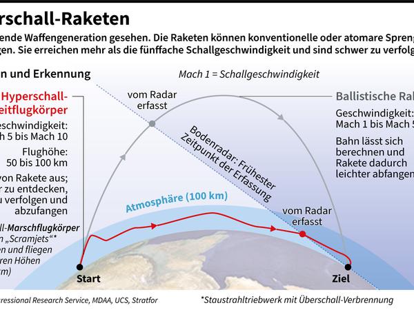 Überschallschnelle Raketen gibt es schon lange, die meisten ballistischen Raketen erreichen hohe Geschwindigkeiten, interkontinentale Raketen rasen in der Endphase ihrer Flugbahn mit bis zu 15.000 km pro Stunde heran. „Das Neue an den Hypersonic-Waffen ist ihre Manövrierfähigkeit unter Bedingungen hoher Geschwindigkeit“, meint der Kieler Sicherheitsexperte.