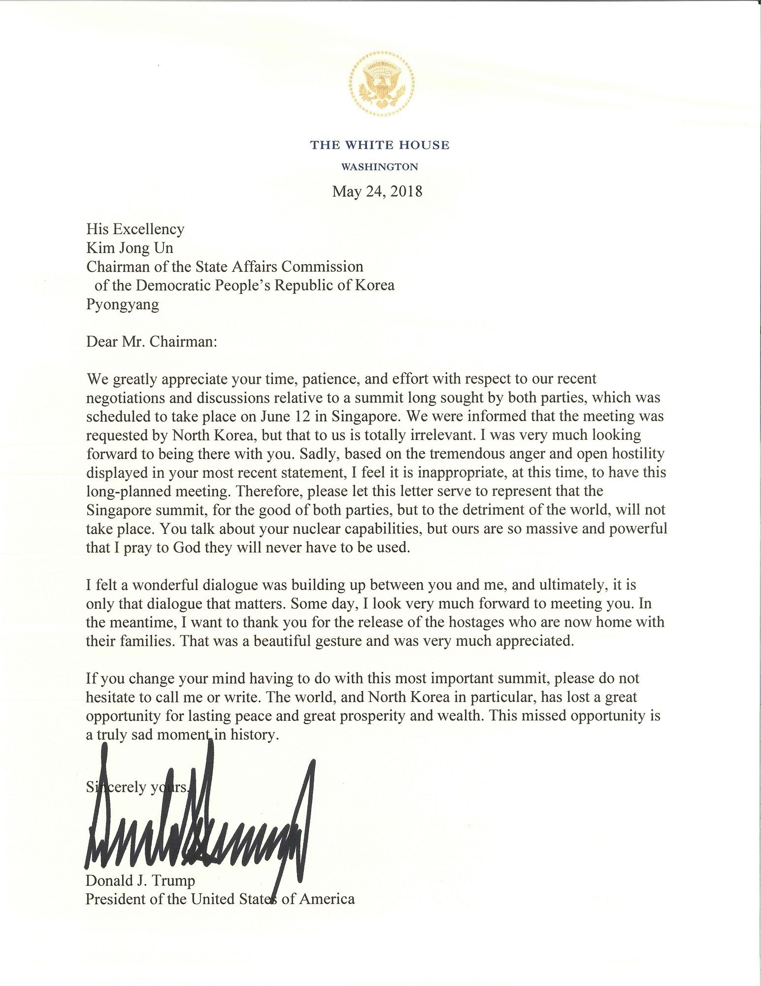 Trump schrieb, er habe sich sehr auf das Treffen gefreut. Leider habe Nordkorea jedoch in seinen letzten Statements „enormen Ärger und offene Feindschaft“ erkennen lassen, er halte deswegen ein Treffen zum jetzigen Zeitpunkt für unangemessen.