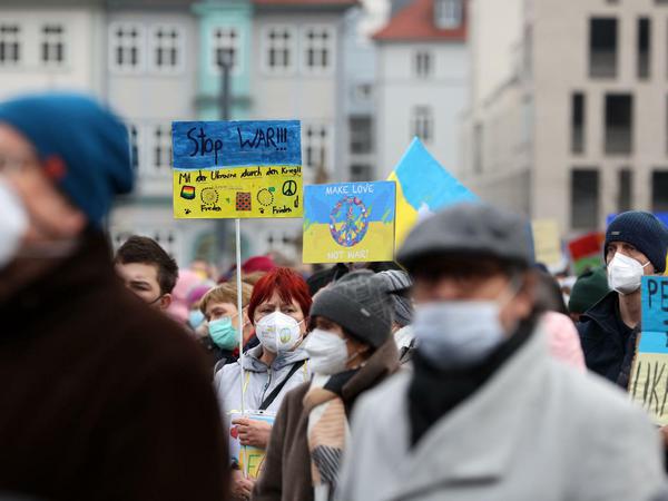 In Osnabrück setzten zahlreiche Menschen mit Friedensgebeten und einer Demonstration ein Zeichen gegen den Krieg in der Ukraine. Auch in vielen anderen Städten kamen etliche Menschen bei Kundgebungen, Friedensdemos und Schweigemärschen zusammen - in Erfurt waren es zum Beispiel Hunderte.