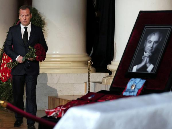 Dafür vor Ort war der frühere russische Präsident Dmitrij Medwedew. Auch Ungarns Regierungschef Viktor Orban nahm an der Gedenkfeier teil. Beide legten Blumen am Sarg nieder. Putin hatte bereits am Donnerstag am Sarg Gorbatschows Abschied genommen und dort rote Rosen abgelegt.