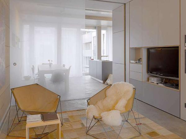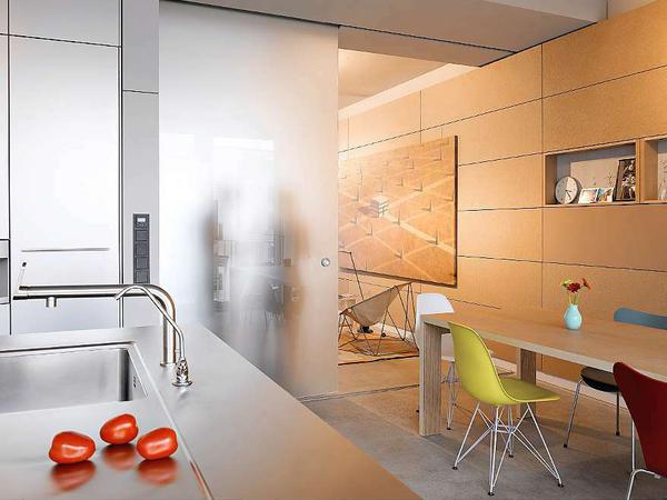 In der Raumaufteilung ist dieses insgesamt achtstöckige Townhouse wie aufeinandergestapelte Lofts gegliedert, wobei die Deckenhöhe variiert und so ein nur 2,28 Meter hohes Zwischengeschoss die Büroräume auf den unteren Etagen vom Wohnbereich darüber trennt. Zimmer im klassischen Sinne gibt es bis auf die Badezimmer nicht. Allerdings können die durchgehenden Etagenräume auch durch Schiebewände geteilt werden. So etwa im dritten Stock, wo mit einem Handgriff ein Gästezimmer mit privatem Bad und offener Küche von der restlichen Etage abgetrennt werden kann. Möglich wird das durch eine pfiffige Kombination von Einbauelementen. „Hier wurden die Einbauschränke in die Architektur eingeplant. Sie sind Teil der Wände“, erläutert Christa Fischer. „Das erzeugt neben der Flexibilität eine visuelle Ruhe und eine gewisse Leichtigkeit.“