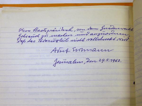 Mehr als ein halbes Jahrhundert nach der Hinrichtung von Adolf Eichmann hat Israel das Gnadengesuch des deutschen NS-Verbrechers veröffentlicht. Zum internationalen Holocaust-Gedenktag wird das handschriftliche Dokument am Mittwoch im Amtssitz des israelischen Präsidenten Reuven Rivlin vorgestellt. Der SS-Obersturmbannführer Eichmann war während der Nazi-Zeit Leiter des sogenannten Eichmannreferats im Reichssicherheitshauptamt in Berlin. Selbiges organisierte die Deportation und Vertreibung von Millionen Juden im besetzten Europa.