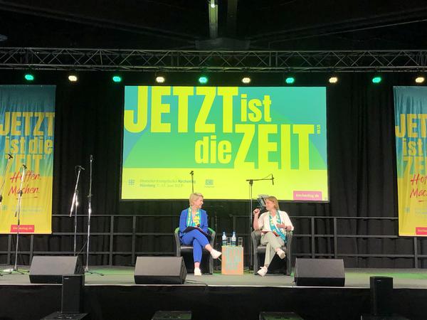 „Ich komme mal zu Ihnen“, sagt Manuela Schwesig. Mit dem Mikrophon in der Hand verlässt die Ministerpräsidentin von Mecklenburg-Vorpommern die Bühne in der Halle 6 das Nürnberger Messegeländes. Sie streift durch die Reihen voller Papphocker, auf denen rund 2000 Menschen mit grünen Kirchentagsschals Platz genommen haben. „Was sind Ihre Hoffnungen für die Zukunft?“, will die SPD-Politikerin von Simone aus Schwerin, Priscilla aus der Schweiz und Martin aus Nordrhein-Westfalen wissen.