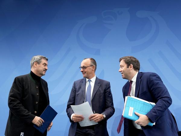 Vor der Sitzung des Bundestags war am Morgen die Unionsfraktion zusammengekommen. Aus Teilnehmerkreisen hieß es, Spahn, Merz und Söder hätten die Ergebnisse des Koalitionsausschusses zunächst vorgestellt.