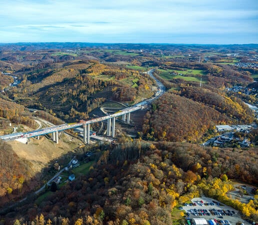 Abgeschlossen sind die Arbeiten an der Rahmedetalbrücke noch nicht. Bislang ist nur die erste Brückenhälfte fertig. Daneben wird an einem zweiten Brückenteil gebaut. Ende 2026 sollen alle Arbeiten geschafft sein.
