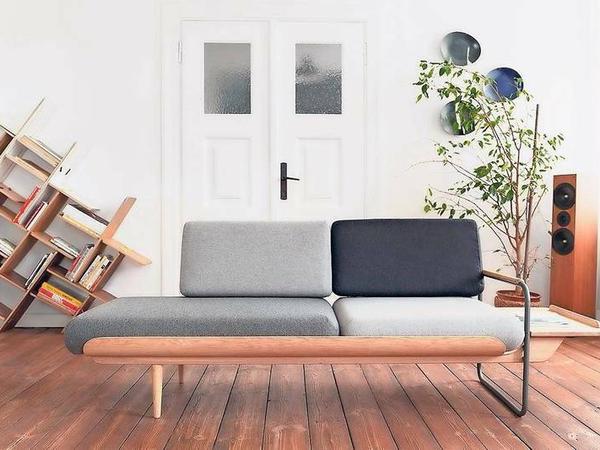 „Napka“ sei ein Möbel quasi aus dieser Zeit. Es kann als Sitzgelegenheit im Flur stehen oder in ein Bett umfunktioniert werden: Die Lehne aus Stahlröhrchen raus, Kissen auf die Holzablage rauf, fertig. Und wieder kam ein neuer Werkstoff zum Einsatz: Massivholz.