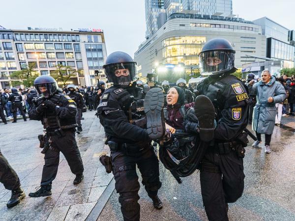 Am Mittwochabend war die Polizei in Deutschland nicht nur in Berlin gegen pro-palästinensische Demonstrationen vorgegangen. In Frankfurt am Main lösten Beamte mit einem Großaufgebot eine verbotene Mahnwache auf. Laut Polizeiangaben nahmen etwa 100 Menschen an der Mahnwache teil.