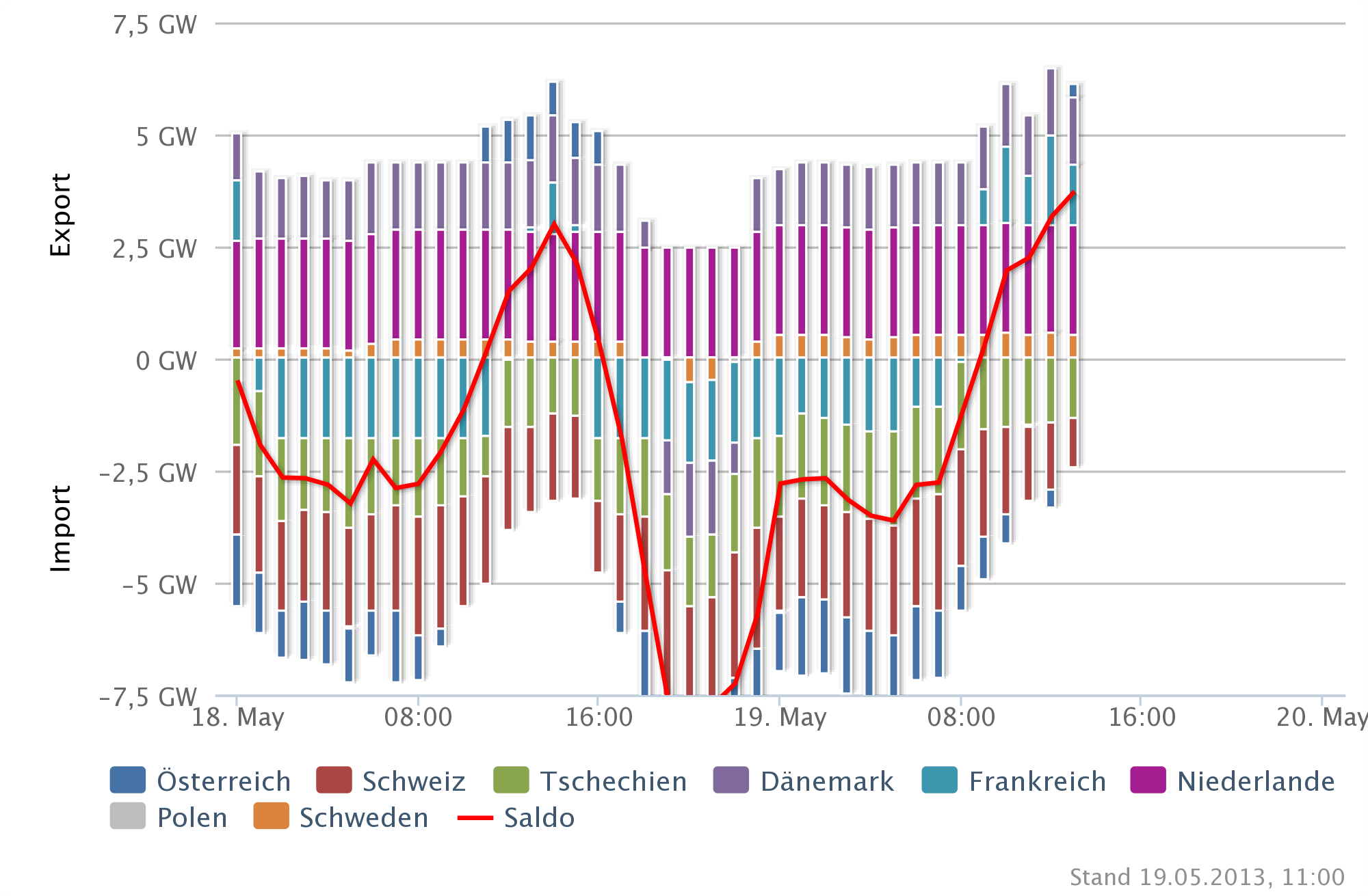 Wie schon das ganze Jahr über war Deutschland auch an Pfingsten wieder ein Netzexporteur von Strom. Das heißt: Deutschland hat mehr Strom in seine Nachbarländer exportiert als importiert. Nachts, am frühen Morgen und auch schon am Abend ist Deutschland häufig Stromimporteur, tagsüber aber meist Exporteur. Wenn man das Stromsystem so sieht, wie die meisten traditionellen Akteure, also die großen Energiekonzerne oder auch den Verband der Strom- und Wasserwirtschaft (BDEW), dann liegt dieser Export an den erneuerbaren Energien, speziell dem Solarstrom. Wenn man aber wie der Chef von Agora Energiewende, Rainer Baake, die aktuelle Rechtslage als Maßstab nimmt, dann wird vor allem Kohlestrom exportiert.