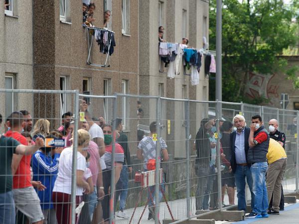 Die Bewohner dürfen die Gebäude zunächst bis zum 25. Juni nicht verlassen. Die Eingänge zu dem Grundstück sind verschlossen. Ein mobiles Versorgungszentrum bringt den Menschen Lebensmittel, auch Windeln und Hygieneartikel würden hier ausgegeben, sagt Sozialdezernentin Petra Broistedt.